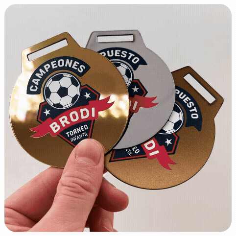 Nos ponemos en contacto para pedirte tu diseño (Illustrator, PDF o PNG/JPG) y definir detalles como el tipo de impresión elegido, bordes redondeados, perforaciones o cualquier otro ajuste. Además, podrás indicarnos si preferís el acabado en color metal u oro. ¡El precio es el mismo! Es importante que nos digas el grosor y ancho de la cinta a pasar por la medalla.