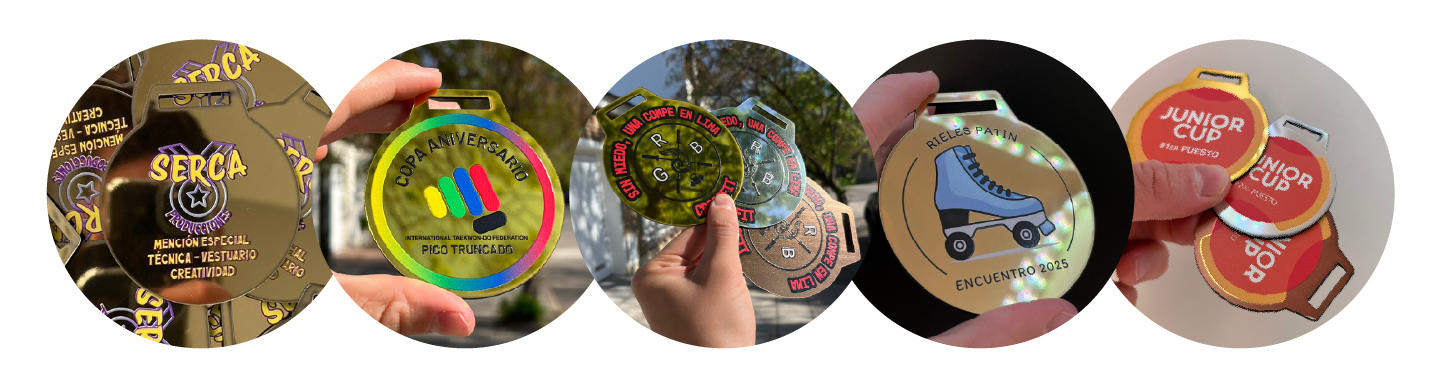 Estampamos tu diseño con impresión UV full color sobre acrílico bicapa simil oro, metal o bronce, logrando una medalla duradera, resistente y llamativa que eleva el nivel de cualquier competencia.